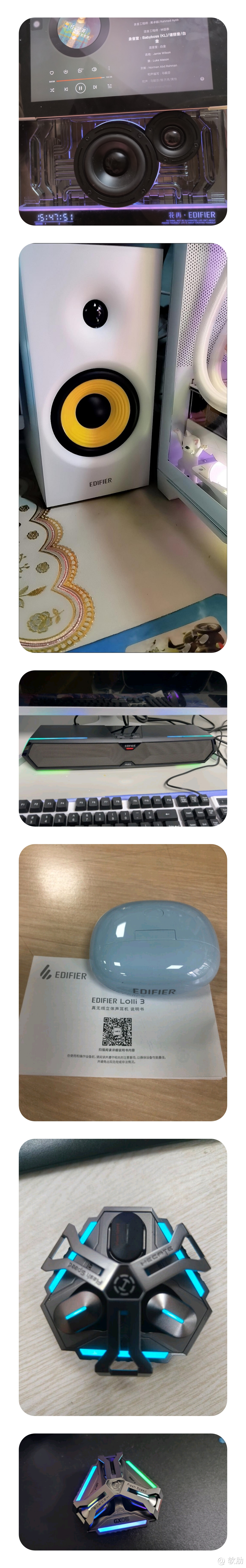 而且旗下产品包括耳机、音箱等,漫步者耳机音质好、佩戴舒适、价格合理,这是我最要Q的一点,真的各种价位段都有,有低价亲民的,也有高端科技的,无论是听音乐、看电影还是玩游戏,都能带给你极佳的听觉体验;再说一说,漫步者音箱,那就更出色了,我相信不少人家里多多少少都可以看一下自家的音响是不是漫步者,尤其在以前互联网还没那么发达的时候,漫步者都能凭借自己出色的表现,把产品销到大江南北的,我家的第1个音箱就是漫步者,包括现在漫步者家的音箱,依旧是具有出色的音质表现和时尚的外观设计,无论是家庭娱乐还是户外聚会,都能满足你的需求。最后来几张漫步者产品的照片吧,哈哈,都是随手拍啊,就不特意用相机去再拍了。
