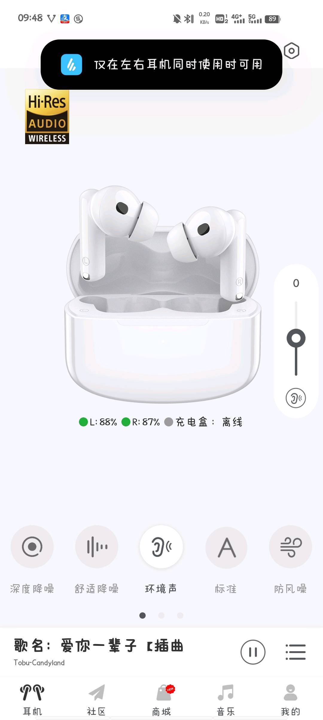 如图,不能开启降噪,拔下右耳机不会停止播放音乐,但两只耳机都能听音乐,怎么搞,两年前买的,找谁修😭