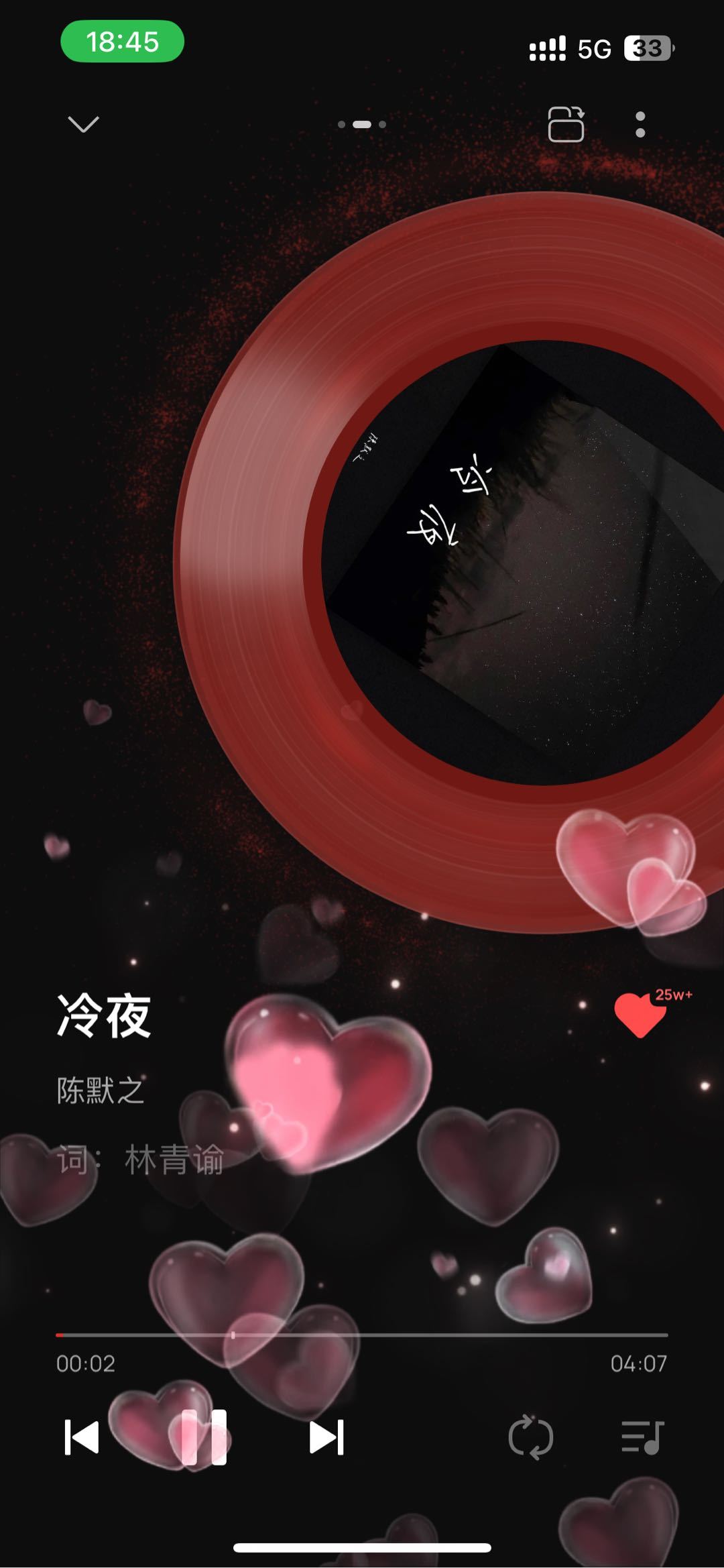 《冷夜》-陈默之今年第一首循环的歌是这首,我感觉这首歌是首温柔的古风歌曲 有点伤感 第一次听是刷视频听到的 刚开始还以为是周杰伦的歌 后来一搜才发现是杰伦公司的!!很有风格哦!!真的很好听我非常累的时候就喜欢听这种歌带上耳机放大音量看着歌词 我感觉我代入了这首歌里面的故事体验歌手想要表达并且带给我的情绪。我超级喜欢代入故事听歌,感觉这首歌故事也很遗憾呢(新年要开开心心的,不要有遗憾哦)
