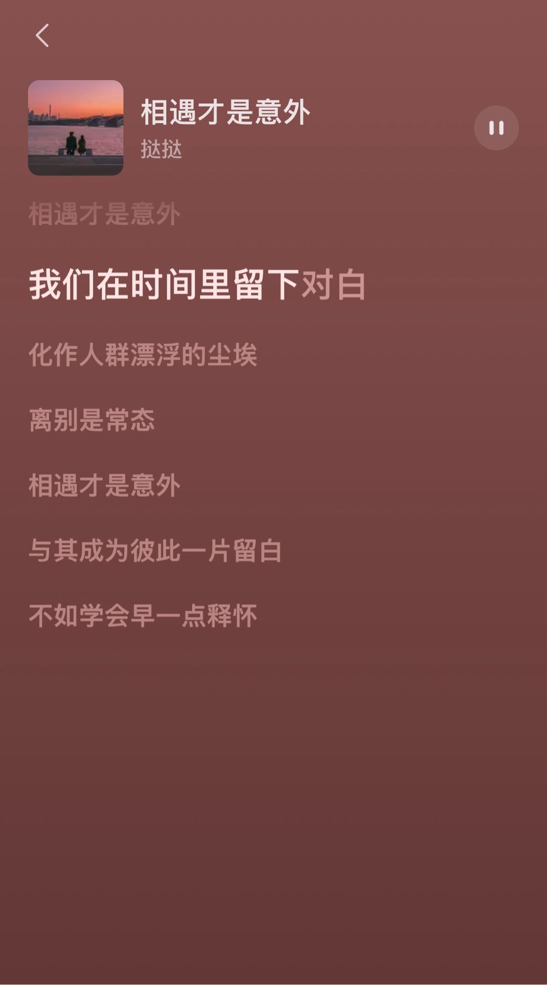 选这首歌循环♻️播放的原因是,歌词好有宿命感,像是在说所有的相遇都是命运埋下的伏笔。每一次的擦肩而过真是无比珍贵,请珍惜身边的亲人朋友。