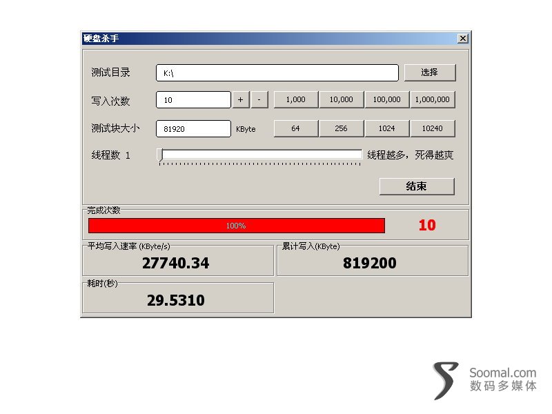 这个USB集线器性能如何呢?我们使用的软件比较特别,这是当年为某编辑特别编写,用于测试intel SSD可重复擦写次数(最后SSD光荣阵亡),这个程序可以测试写速度,我们测试得到的写速度为27740K/s,这个性能不算太好也不算糟糕,中等偏上的水平,将此硬盘直接连接主板,测得的数据为29054K/s。测试表明,这个集线器性能具备实用性。